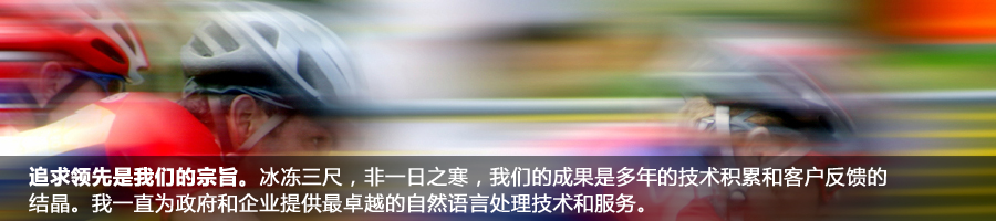 自從成立以來,我們?yōu)榭蛻籼峁└咝Ш椭悄芑男畔⑻幚砉ぞ吆妥稍兎?wù)。在這個(gè)信息爆炸的時(shí)代,如何讓互聯(lián)網(wǎng)上和企業(yè)內(nèi)部的海量信息為我們帶來更多的價(jià)值需要高度智能化的信息處理工具。我們提供的技術(shù)能夠高效并且準(zhǔn)確的對(duì)大量文本信息進(jìn)行處理、檢索、挖掘、翻譯等工作,并可方便地與信息系統(tǒng)的其他模塊進(jìn)行整合。